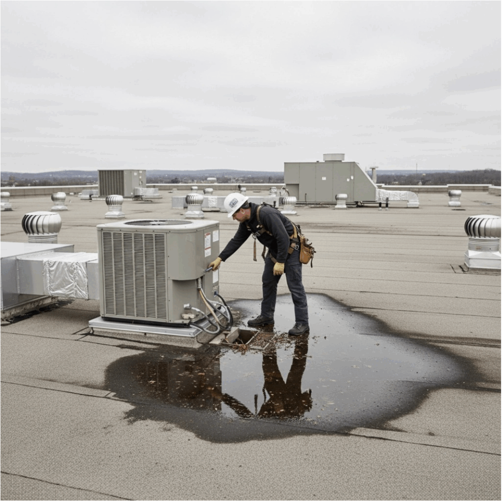 HVAC units, vents, and other equipment sitting directly on commercial roofs create multiple potential leak points that require regular monitoring. Plus, foot traffic from maintenance crews increases wear and tear on the roofing membrane.